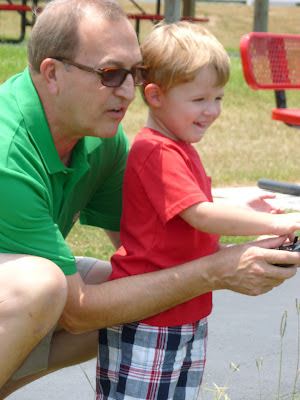 Papa brought his boat this visit and they went up to our pond to see how it works. No, I did not, participate, since it was 1 million degrees outside. HA! Seriously, this heat has got to go!